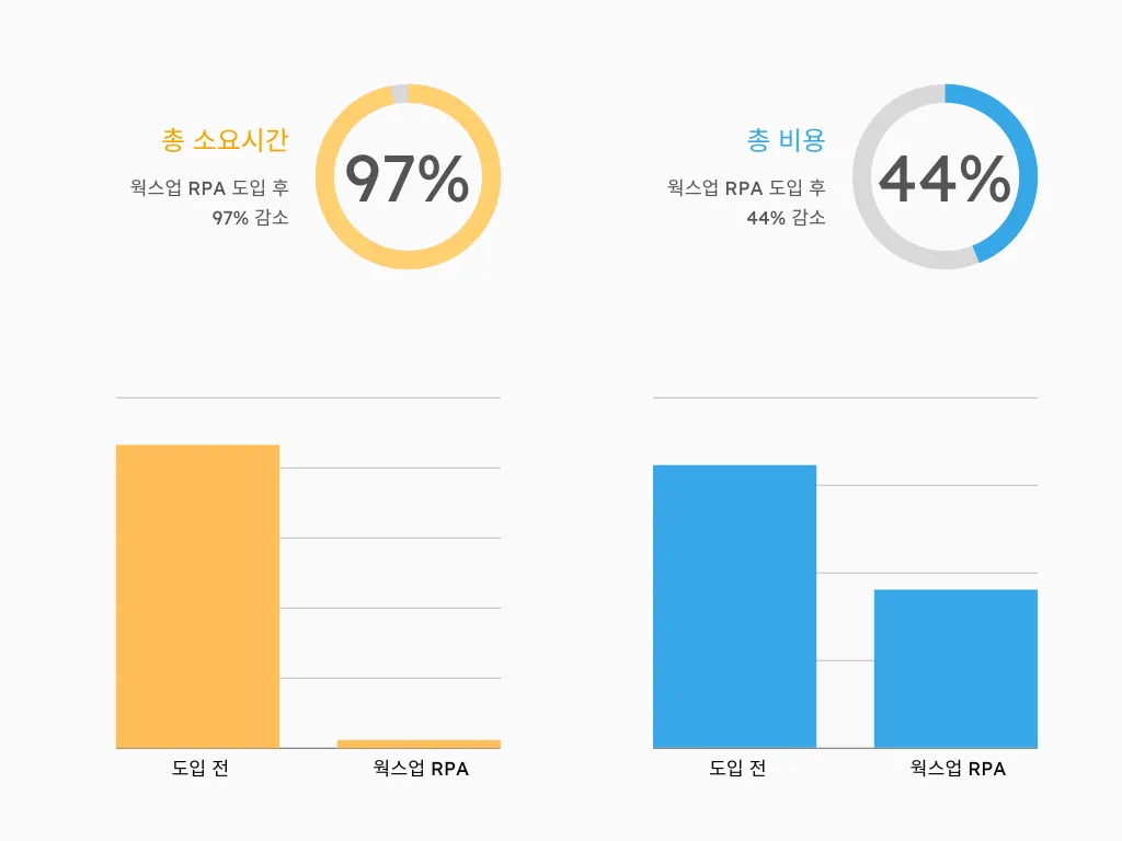 웍스업 RPA 도입 후 시간은 97%, 비용은 44% 감소했습니다. 놀라운 성과입니다.